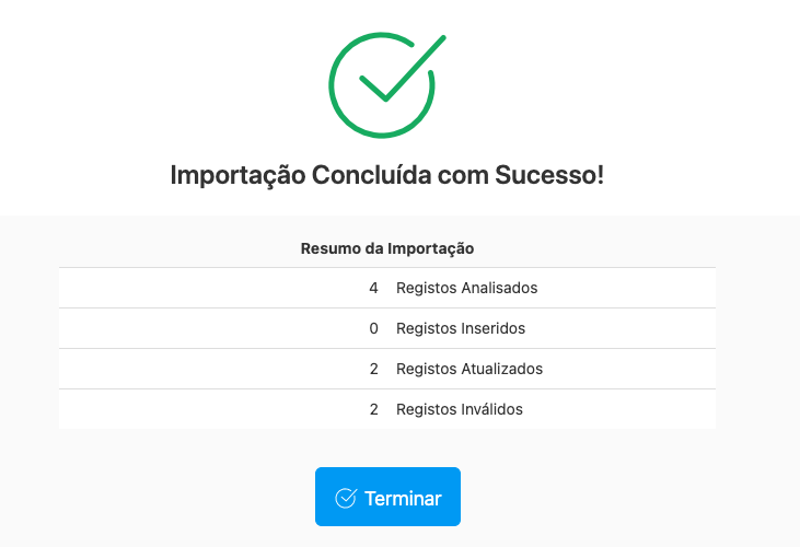 No final, pode verificar se a importação foi concluída com sucesso e verificar o resumo.