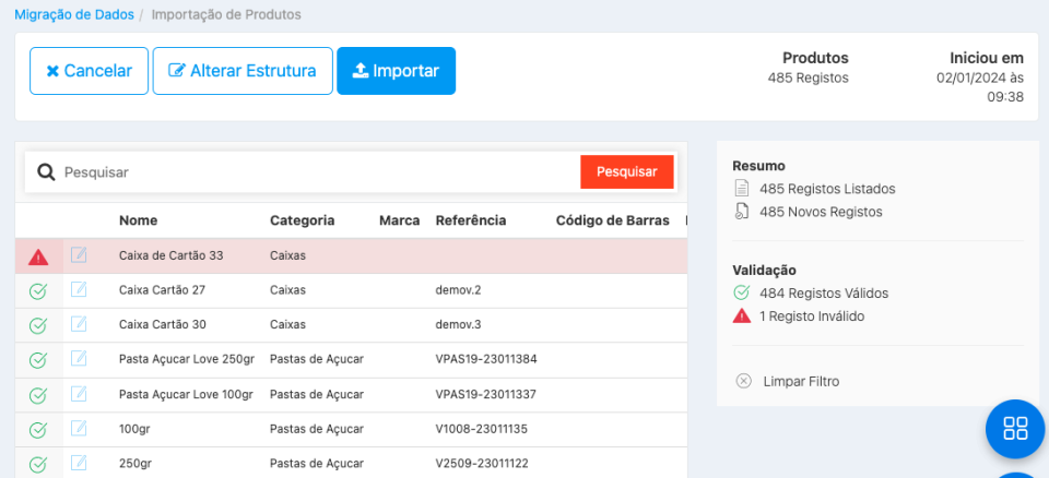 Caso a linha do produto esteja a cor-de-rosa, significa que algo está mal. Se clicar no produto, pode fazer a alteração manualmente. Caso sejam vários produtos, pode cancelar a importação, corrigir o ficheiro e voltar a fazer upload.