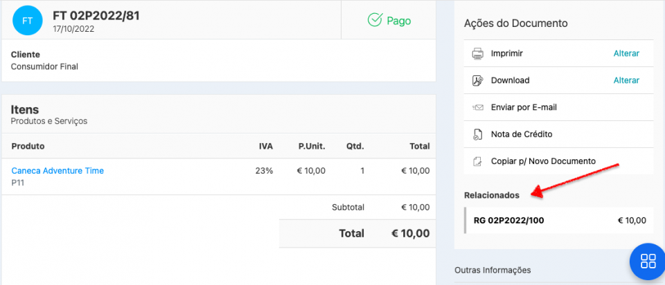 Vá a Gestão > Documentos > Documentos e procure a fatura cujo recibo pretende anular. Clique na fatura e, do lado direito, terá em Documentos Relacionados a indicação do recibo (RG). Clique para abrir.