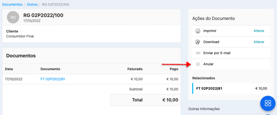 Tendo o recibo aberto, do lado direito encontrará a opção para Anular.