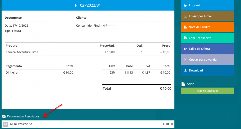 No POS, vá a Documentos > Documentos e procure a Fatura cujo recibo quer anular. Clique na Fatura e verá em baixo Documentos Associados, onde terá o recibo (RG). Clique para abrir.