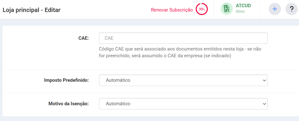 Caso pretenda trabalhar com, por exemplo, dois CAEs ao mesmo tempo, deverá ter configuradas duas lojas. Para associar o código CAE a uma loja, basta ir a Configuração > Definições > Lojas e Caixas. Edite a loja e encontrará o campo do CAE.