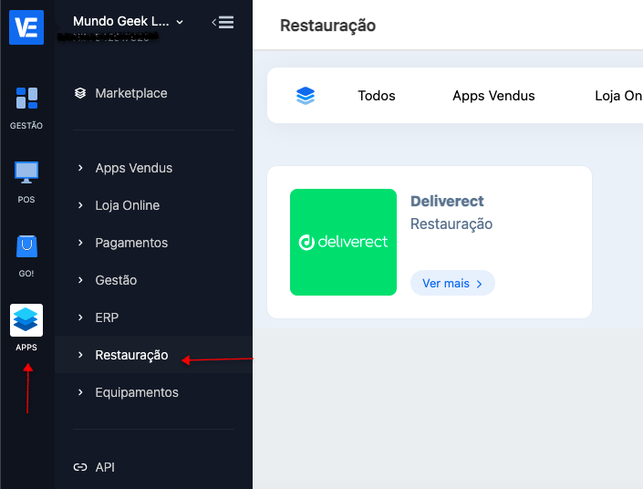 Agora, regresse à sua conta Vendus e em Apps > Restauração encontrará a Deliverect.