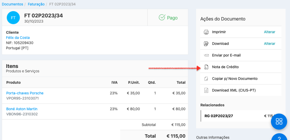 - No campo Ações do Documento (lado direito), clique em Nota de Crédito.