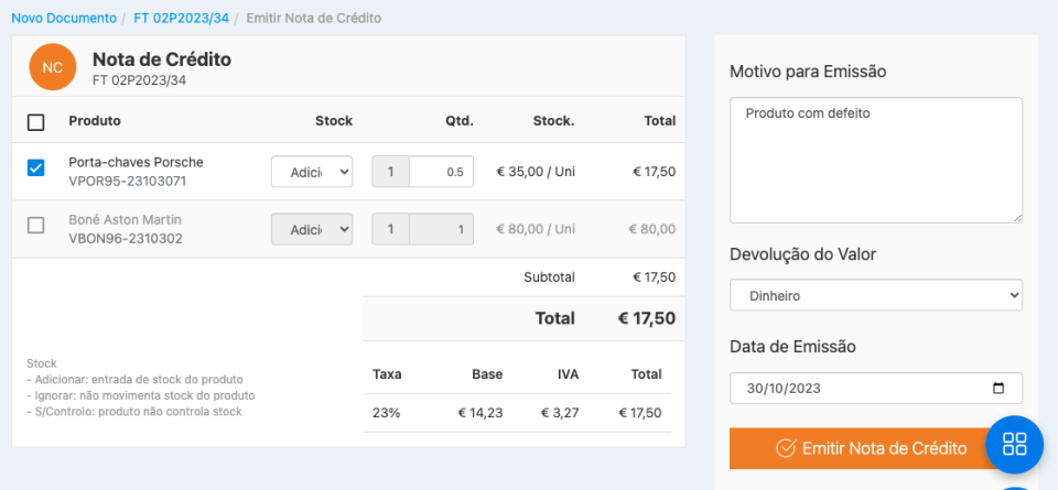Por vezes, pode não querer fazer a Nota de Crédito total e querer apenas devolver o valor relativo a um produto ou a uma parte do produto.
