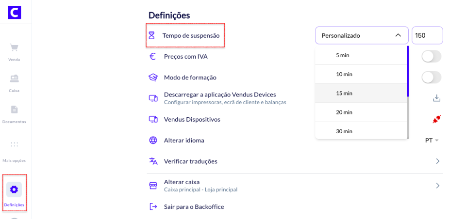 Ao fim de determinado tempo sem utilizar o Vendus, este entra em modo de suspensão, sendo necessário inserir o PIN para voltar ao programa. O tempo de suspensão é configurável, ou seja, pode indicar que o ecrã deve entrar em suspensão após 20 minutos de inactividade por exemplo.