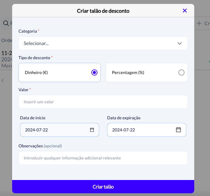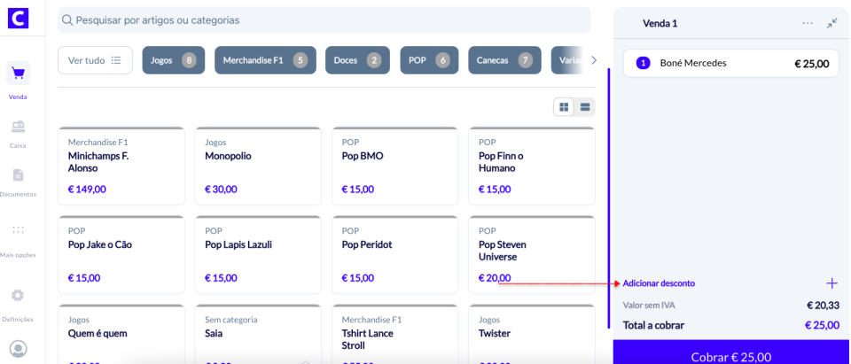 Para o utilizar, no ecrã da Venda clique em adicionar desconto e terá um campo para preencher com o código do talão.