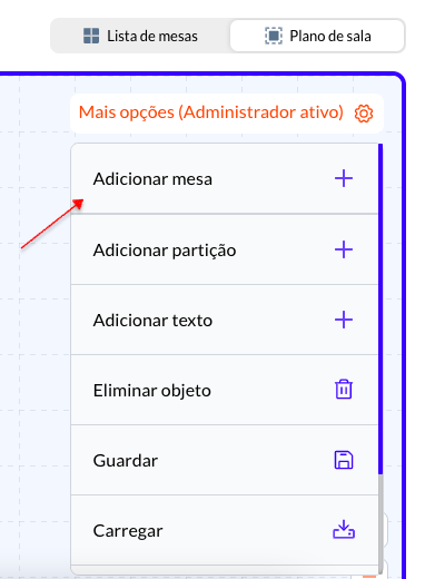 Para aceder à criação do layout, no POS, clique em Plano de Sala e depois em Mais Opções.