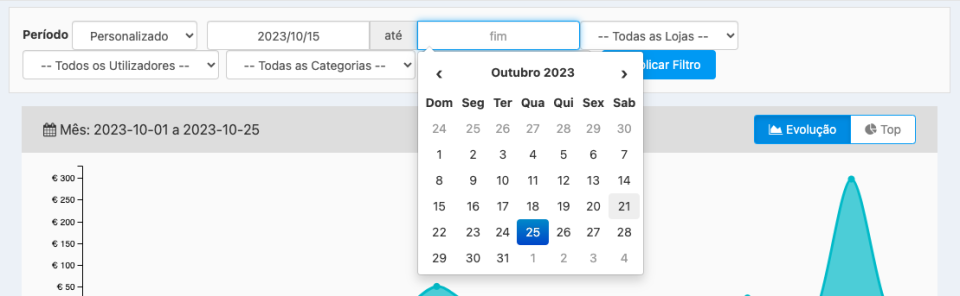 Caso necessite de consultar a venda dos produtos num determinado espaço temporal, como por exemplo a última semana, escolha em Período a opção Personalizado