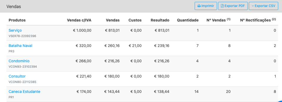 Pode tambérm fazer download do relatório clicando em Exportar PDF ou Exportar CSV (gera um ficheiro csv que pode ser lido, por exemplo, no Excel) ou imprimir directamente do Vendus.