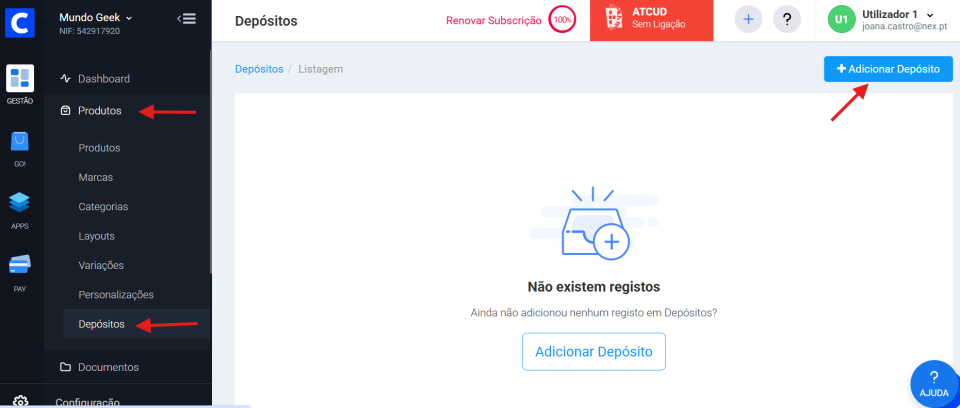 Para configurar um depósito no Cegid Vendus, terá de ir a Gestão > Produtos > Depósitos
