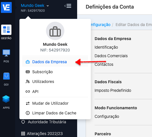 No Vendus, pode escolher entre permitir trocas entre lojas ou não. Para fazer essa configuração, terá de inicialmente aceder aos dados da sua empresa.